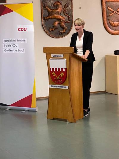 Eindeutiges Ergebnis bei der Mitgliederversammlung der CDU Großkrotzenburg: Ohne Gegenstimme nominierten die Christdemokraten ihre Parteichefin Theresa Neumann zur Kandidatin bei der anstehenden Bürgermeisterwahl im kommenden März. Neben den Mitgliedern waren zahlreiche parteilose Unterstützerinnen und Unterstützer bei der Versammlung anwesend, um Neumann ihren Rückhalt auszudrücken. Als Versammlungsleiterin fungierte die Bundestagsabgeordnete Dr. Katja Leikert.